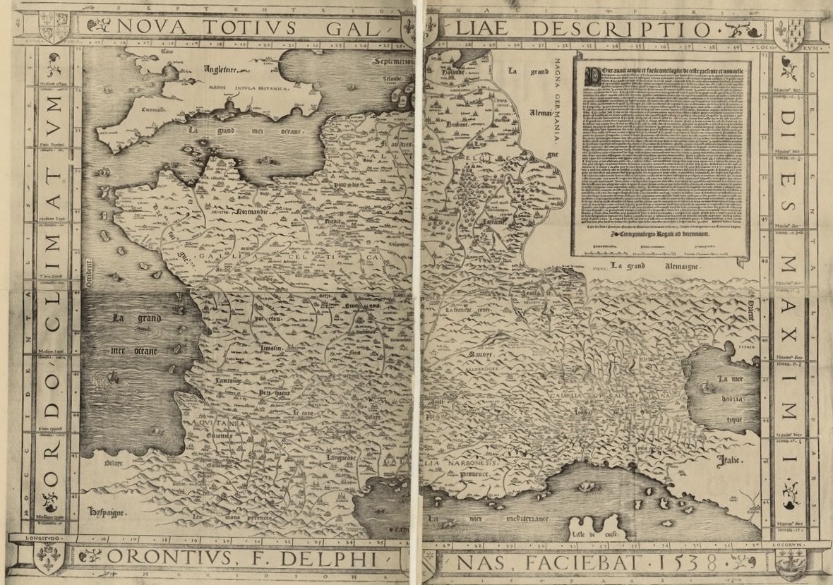 New and improved cartography, in this map by Oronte Finé of 1538, gave an impression of the broad extent of French dominion, from the Atlantic and Mediterranean seas to the Rhine, the Alps and into Italy. Gallica BNF